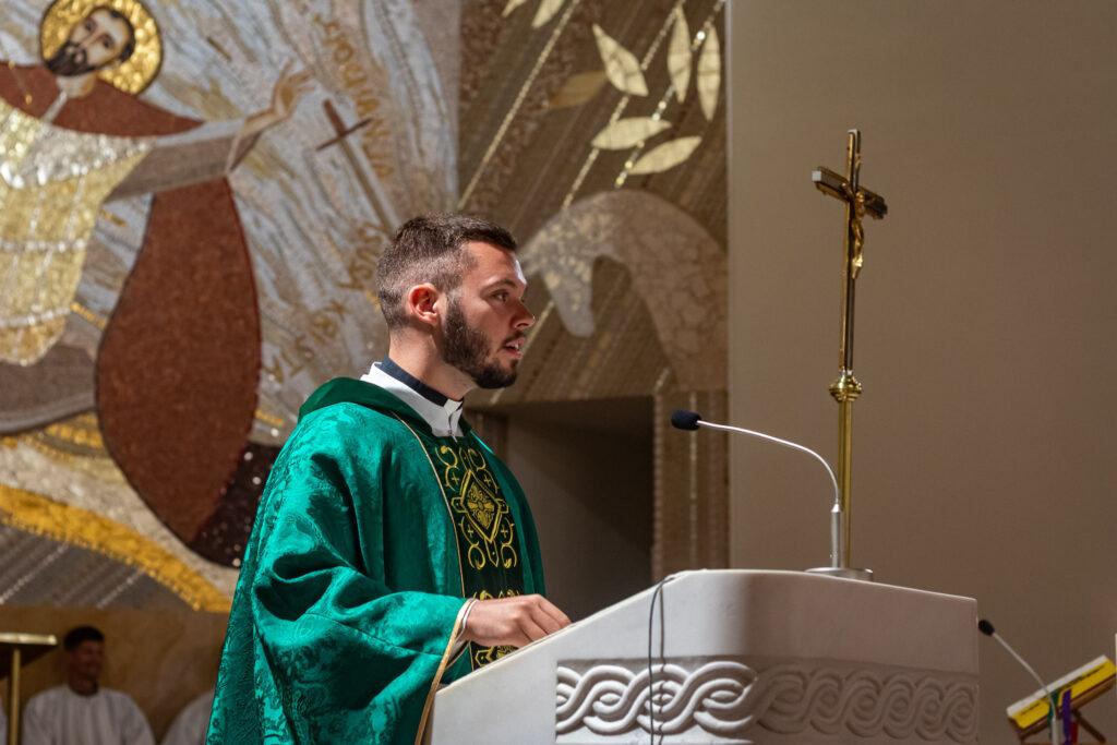 Osvrnuvši se na evanđelje i Isusovo pitanje “Što kažu ljudi tko sam ja?”, propovijednik ističe kako je najprije važno zapitati se “što sam čuo o Isusu? Što sam primio kroz svoje odrastanje, svoju okolinu i kroz odgoj, o Isusu?” Važno je stoga dati odgovor na pitanje tko je Isus za mene? Što je učinio za mene? Na što me poziva? “Nije ugodno živjeti evanđelje jer ono zahtjeva žrtvu od svih nas. Ono zahtjeva da se ostavi sve i da se pođe za Gospodinom, da Njega stavimo na prvo mjesto” naglašava vlč. Šešek. Apostol Petar usprotivio se Isusovom navještaju muke, nije mu to bilo ugodno čuti, ali bilo je potrebno prihvatiti. Tako se živi svrhovit život. “Mi smo stoga pozvani u ovom trenutku naviještati radosnu vijest i ići za Gospodinom, proslaviti Ga u ovom vremenu u kojem živimo i baš tamo gdje jesmo” zaključuje vlč. Šešek.
