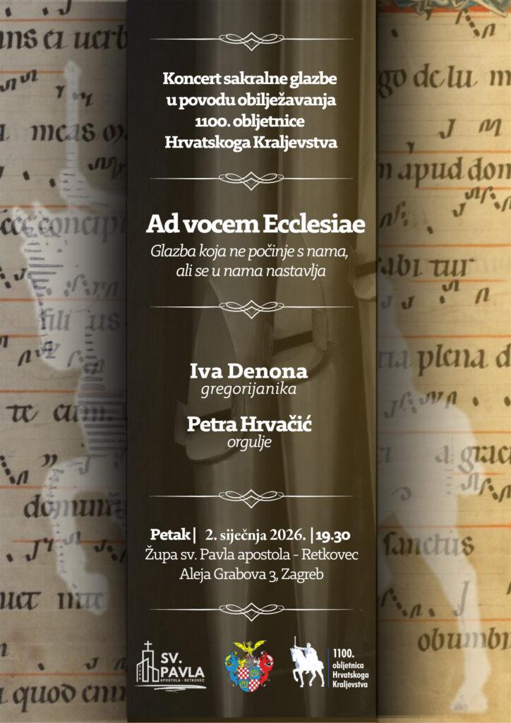 Pozivamo vas na koncert sakralne glazbe u povodu obilježavanja 1110. obljetnice Hrvatskog Kraljevstva, koji će se održati 2. siječnja 2026. u 19.30 sati. Dobro došli!